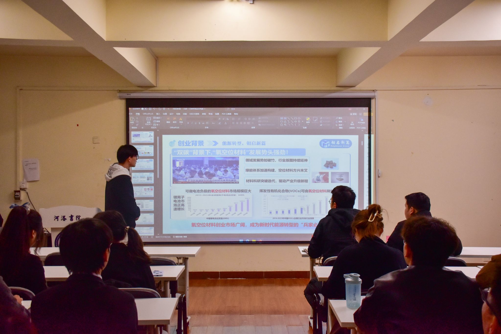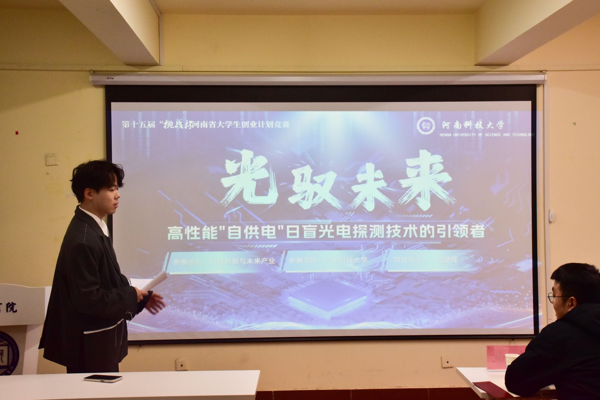 复赛现场,15支“挑战杯”参赛团队依次登台,通过PPT汇报的形式,清晰呈现项目的核心思路、创新亮点与实践价值。从选题背景到方案设计,从预期成果到可行性分析,团队成员以饱满的热情和严谨的逻辑,展现了河洛学子的创新风采与实践能力。