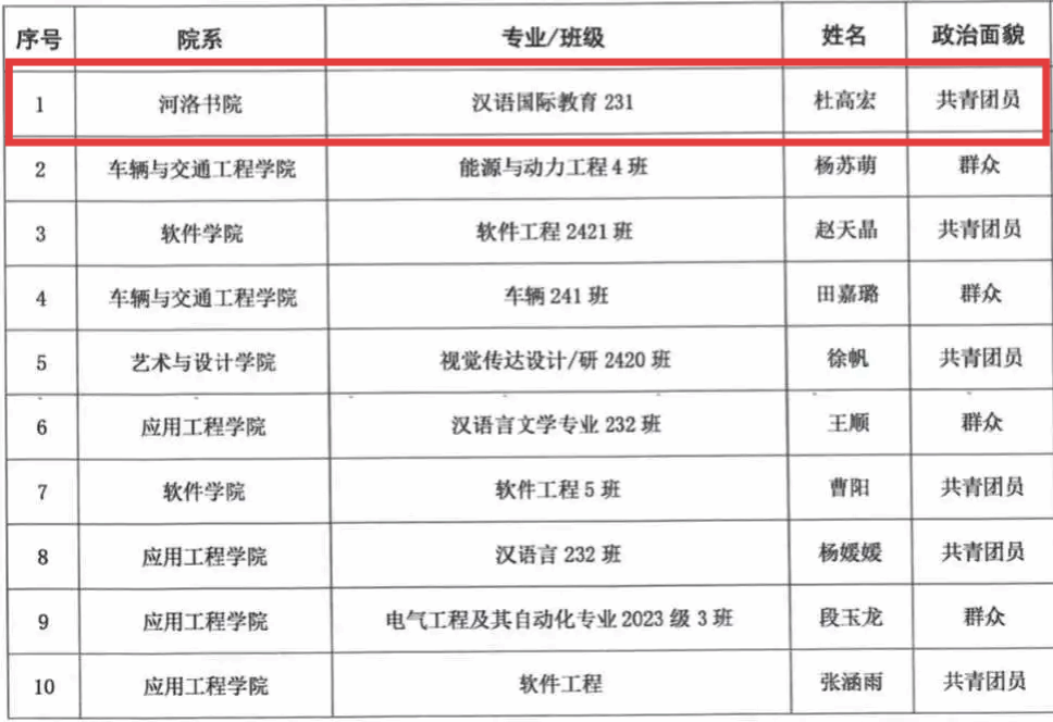 此次荣誉的获得,既是对杜高宏同学个人实践成果的充分肯定,也是我院深化“实践育人”理念、推动“专业+实践”融合培养模式的生动体现。长期以来,河洛书院始终围绕“立德树人”根本任务,积极引导学生将课堂知识转化为服务社会的实际能力,鼓励青年学子在基层实践中受教育、长才干、作贡献。 希望杜高宏同学珍惜荣誉、再接再厉,继续在实践中锤炼本领、增长才干。同时,号召全院学子以其为榜样,树立“扎根基层天地阔”的理想信念,主动响应时代召唤,在服务人民、奉献社会的火热实践中绽放青春芳华!